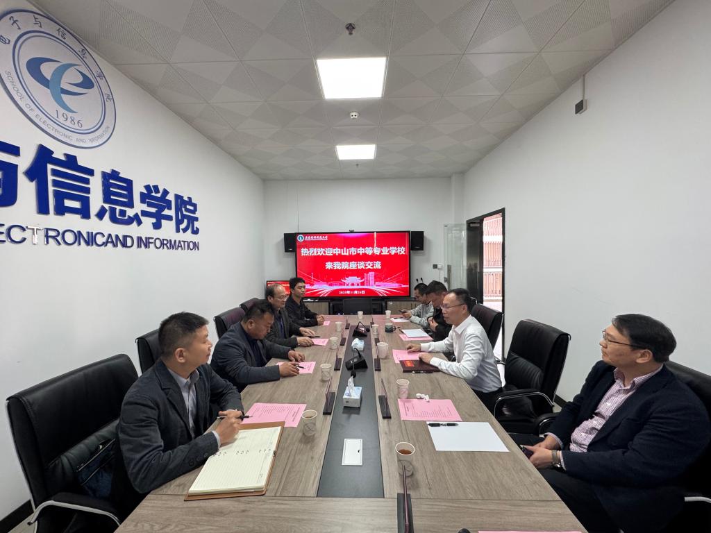 11月26日,中山市中等专业学校(以下简称中山中专)党委副书记、校长刘尚楠,党委委员、副校长鲁东晴,信息技术部主任舒荣,骨干教师刘开云一行4人前来白云校区开展调研交流。williamhill威廉希尔官网党委书记罗旭辉,院长单纯,副院长林沛,电子工程系主任赖森锋,党政办公室主任吴晨阳参加座谈会,双方围绕深化“3+4”中本贯通人才培养模式、加强校际合作、共育高素质技术技能人才等议题进行了深入座谈与交流。