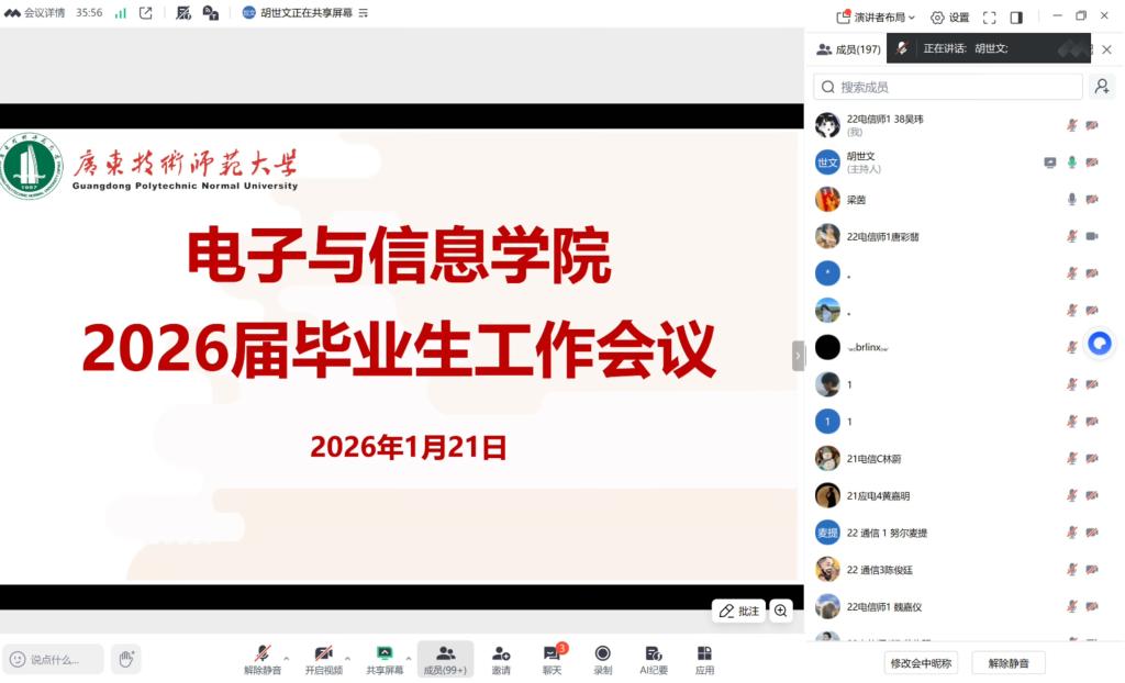 1月21日,williamhill威廉希尔官网以线上会议形式召开2026届全体毕业生工作会议。学院党委副书记梁茵、教学副院长林沛以及相关负责老师参加会议。